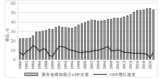 图1中国服务业增加值占GDP比重和GDP增长速度
