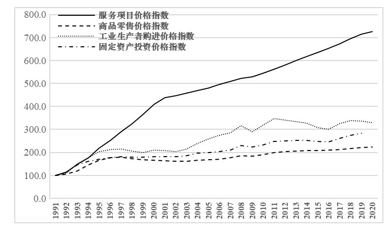 数据来源:服务项目价格指数在2000年之后停止了统计,1991~2000年服务项目价格指数来自程大中(2008)(对缺失值的处理:2016~2020年“家庭服务及加工维修服务费类居民消费价格指数”用“家庭服务类居民消费价格指数”代替;2016~2020年“城市间交通费类居民消费价格指数”用“交通费类居民消费价格指数”代替;2016~2020年“学杂托幼费类居民消费价格指数”用“教育类居民消费价格指数”代替;2016~2020年“市内公共交通费”和“个人服务类居民消费价格指数”根据趋势外推法预测得到),2001~2020年数据根据相同方法,使用家庭服务及加工维修服务费、医疗保健服务、个人服务、市内公共交通费、城市间交通费、通信服务、学杂托幼费、文娱费、旅游及外出、住房租金的价格指数取均值计算服务项目价格指数。2000~2015年数据来自历年《中国统计年鉴》,2016~2020年数据是笔者汇总多个来源计算得到。商品零售价格指数来自历年《中国统计年鉴》。