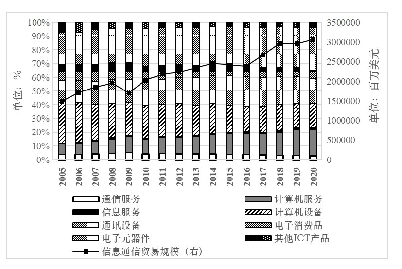 图8 2005-2020年全球信息通信贸易的5类产品和通信服务、计算机服务、信息服务出口