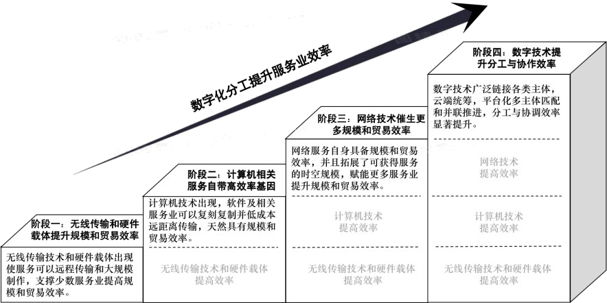 数字技术广泛应用带来服务业分工的快速发展。数字技术使分布于不同空间中的服务片段能够在时间上同步并在数字平台上共享,各部分进程的同步可视化协调使分工成为可能。由此带来的分工效率促进了服务业新业态、新模式的不断出现。