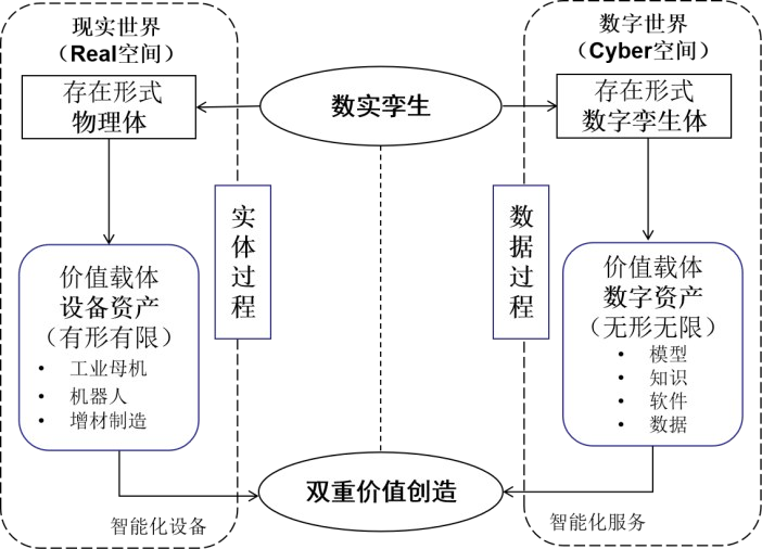 数据资源的汇聚计算和全域全链的嵌入应用,使得原本一个物理世界的实体过程变为实体过程与数据过程的孪生,带来实体和数据双重价值。在现实世界,装备(产品)以物理实体存在,在生产过程中产生增加值,形成了物理装备(产品)资产;与此同时在数字空间,装备(产品)的数字模型同步生成,形成了数字资产。所有经济社会活动同时获得实体价值和数据价值,不断彼此赋能,共同实现增值,此时一个行为过程将实现双重价值创造,提升了经济效率并带来新的增长空间,如图15所示。