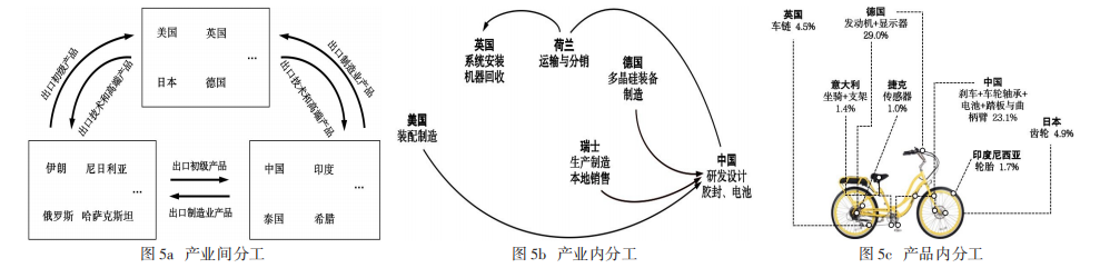 产业间分工、产业内和产品内分工都可以发生在全球范围。产业间分工典型表现为不同经济体在初级产品、制造业产品、技术和高端产品等不同产业部门间的分工活动,如图5a所示。产业内分工是在同一产业部门内部(如图5b中的太阳能光伏产业)供应链上的分工。产品内分工是同一产品(如图5c中的派德高电动自行车)的不同工序或组件的跨国供应。