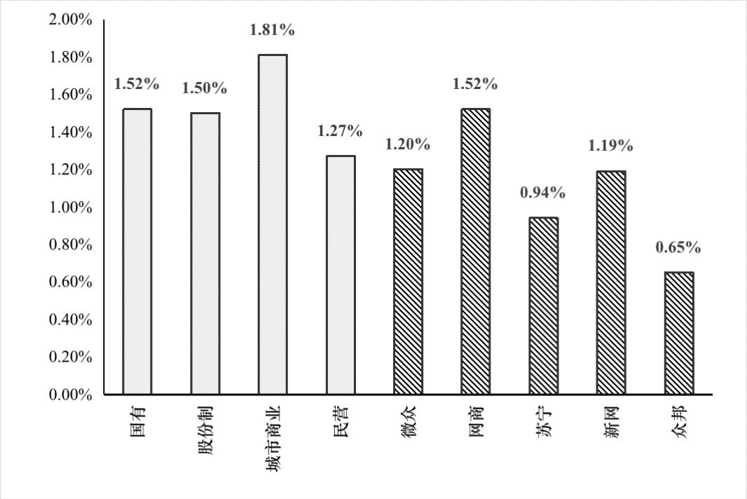 注:国有大型商业银行 、股份制商业银行、城市商业银行和民营银行的不良贷款率为2020年四季度数据,5家互联网银行的不良贷款率为2020年数据。农村商业银行2020年四季度不良贷款率相对较高,在此未列入。自2019年起,邮政储蓄银行纳入“大型商业银行”汇总口径。