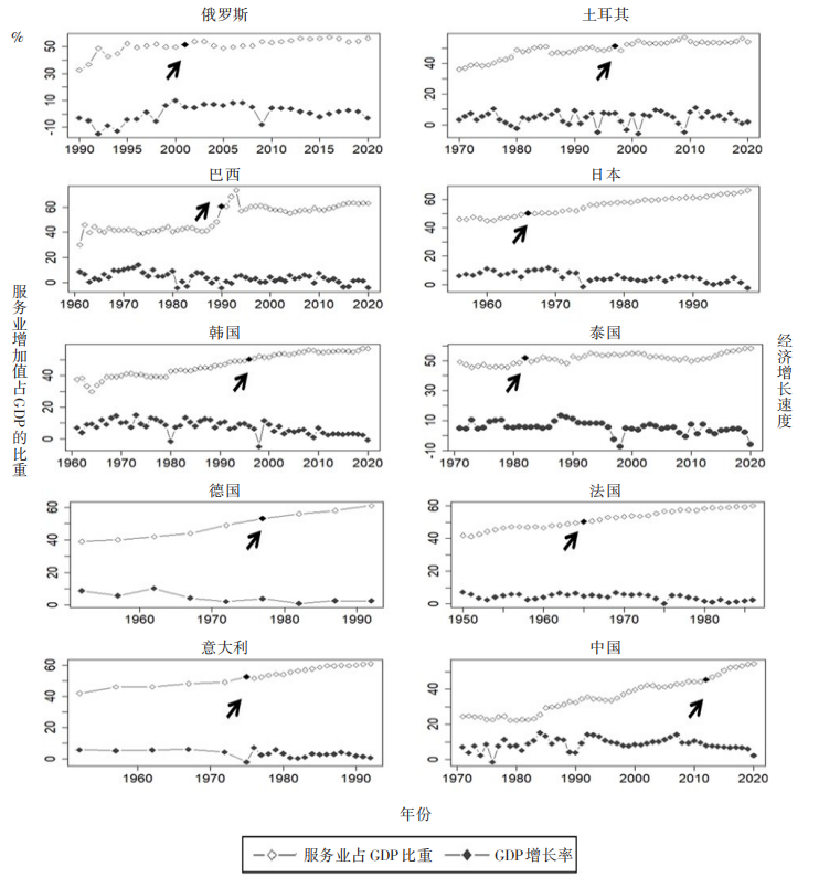 国际经验显示,服务业成为国民经济主要产业后经济增长速度会下降。为了与我国的情况有较强可比性,本文选取了服务业比重在20世纪后半期以来超过50%、同时也是人口超过5000万的较大国家样本(如图2所示)。图2中箭头所指年份,大致是对应经济体服务业超过50%的时期,此时起,各个经济体都呈现出服务业比重继续上升和经济增长速度下行的趋势,即服务业比重与经济增长速度呈现出“喇叭口”的形态。最后一张图是中国,可以看到,我们未能脱离开这个规律性趋势。