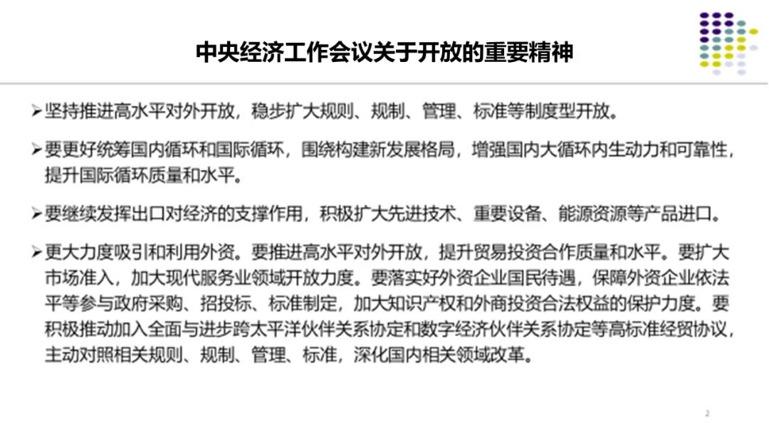 今年的经济工作会议对明年和今后的经济工作做了全面的部署,会议中一个突出的重点,就是特别强调了高水平开放,强调了更好统筹双循环,强调了提升国际循环的质量和水平,强调了出口的支撑作用,强调了先进技术、重要设备和能源资源进口,强调了吸引和利用外资,强调了制度型开放。