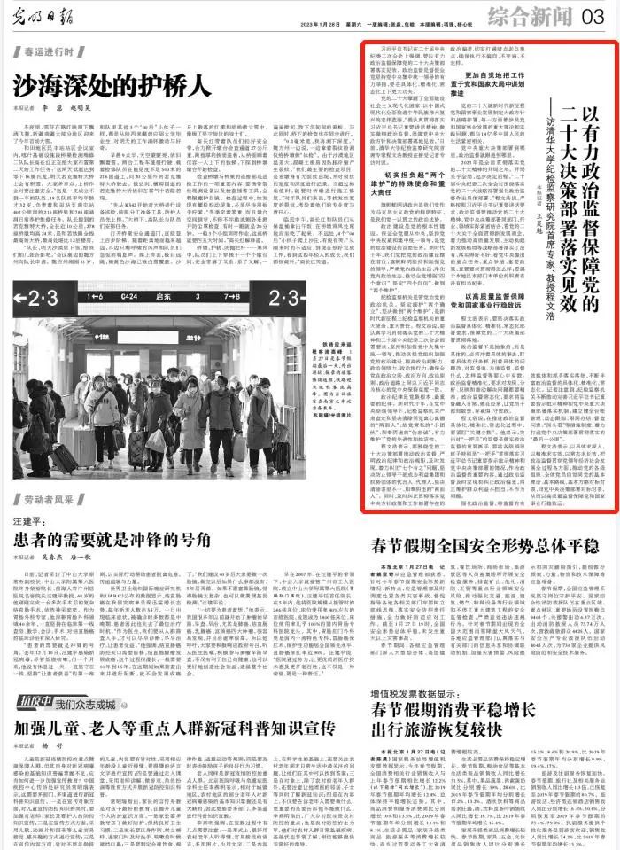 2023年是全面贯彻落实党的二十大精神的开局之年。开局关乎全局,起步决定后程。“二十届中央纪委二次全会对围绕落实党的二十大战略部署强化政治监督作出具体部署。”程文浩说,严格按照习近平总书记重要讲话要求,政治监督要推动党的二十大精神、党中央决策部署同部门、行业、领域实际紧密结合,看党的二十大关于全面贯彻新发展理念、着力推动高质量发展、主动构建新发展格局等战略部署落实了没有、落实得好不好;看党中央提出的重点任务、重点举措、重要政策、重要要求贯彻得怎么样;看属于本地区本部门本单位的职责有没有担当起来。
