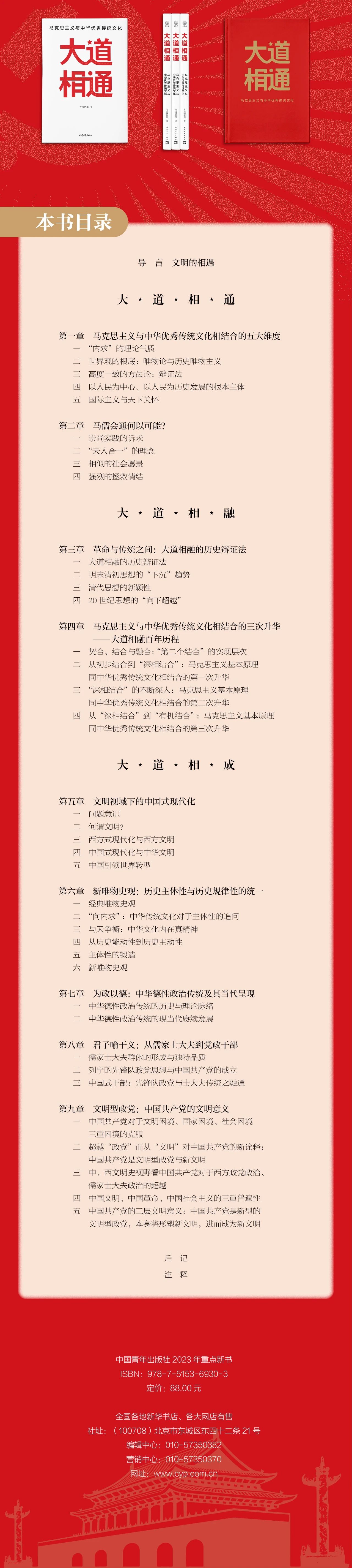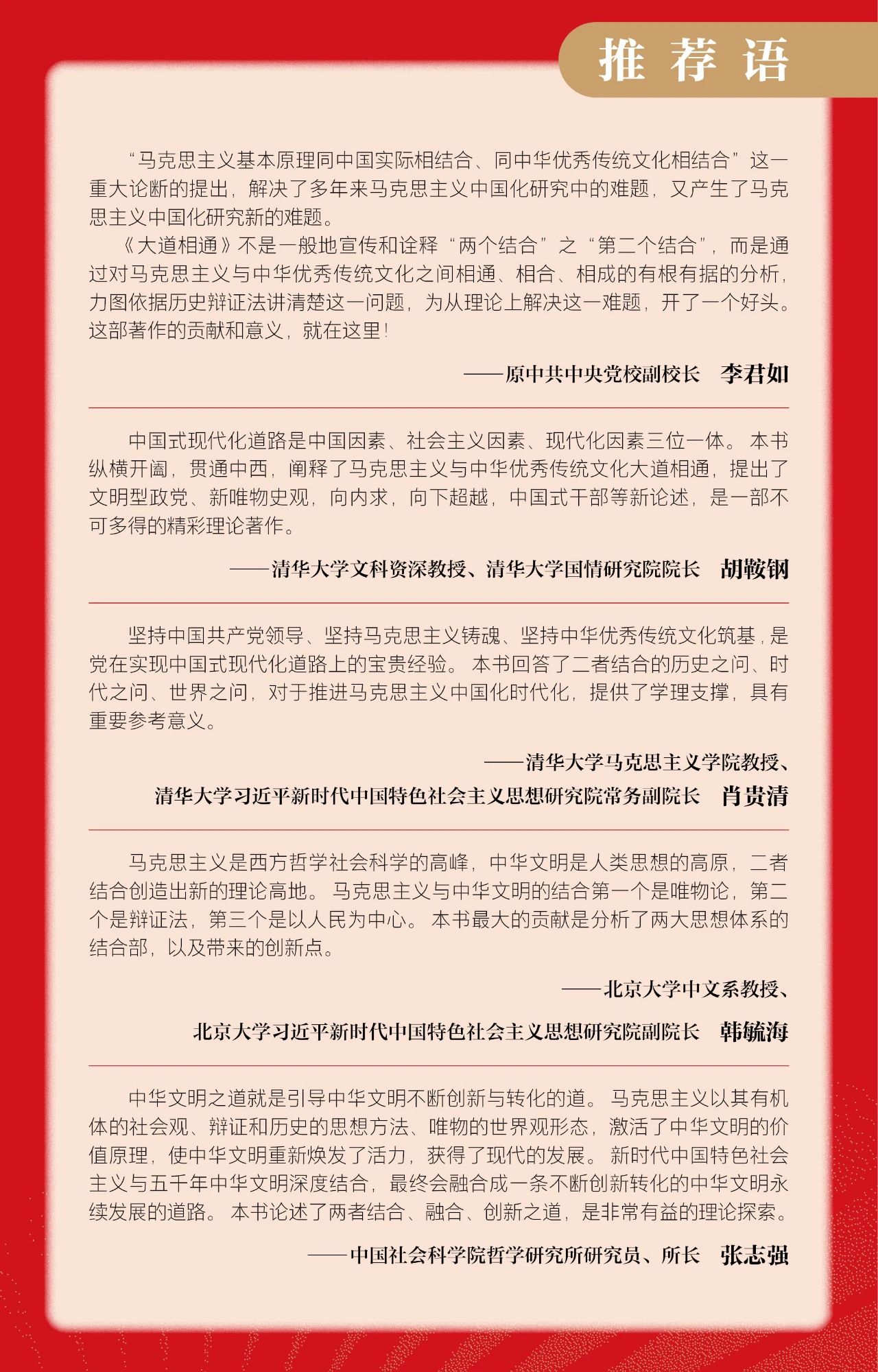 《大道相通:马克思主义与中华优秀传统文化》提出了文明型政党、新唯物史观、向内求、向下超越、中国式干部等新论述,用富有理论思维的大众化语言,深度解读“第二个结合”的理论逻辑和融通实践,对推进马克思主义中国化时代化作出新的理论探索,对广大党员干部深刻理解党的二十大精神有重要作用。