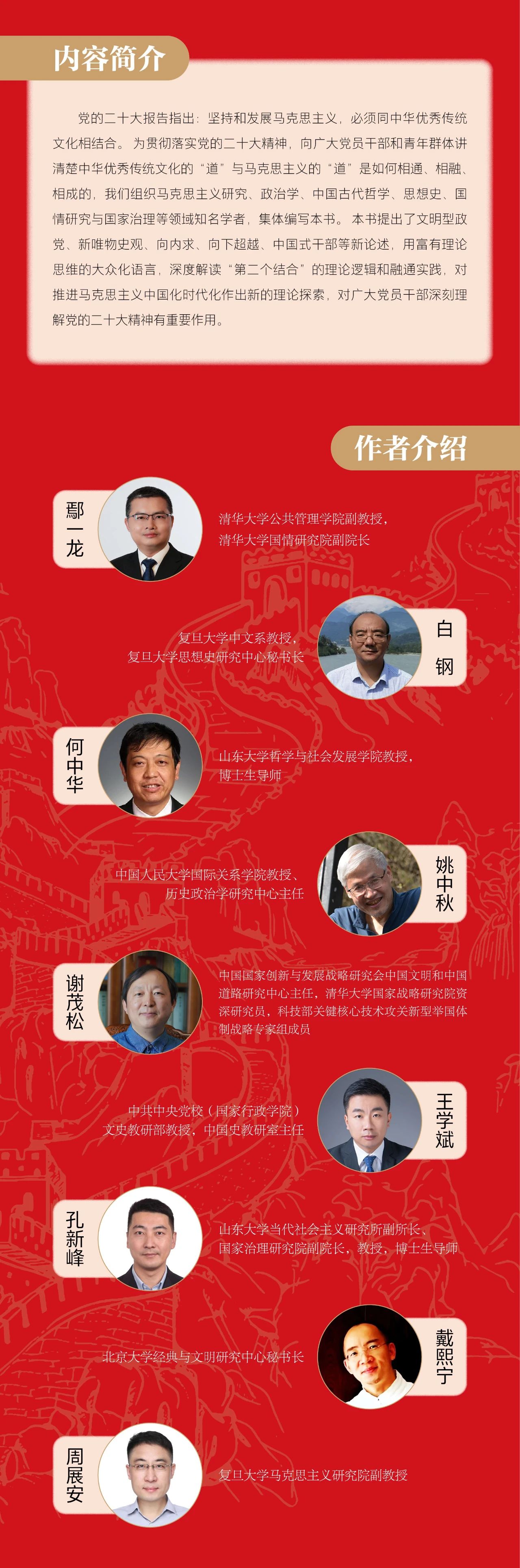 党的二十大报告指出:坚持和发展马克思主义,必须同中华优秀传统文化相结合。为贯彻落实党的二十大精神,向广大党员干部和青年群体讲清楚中华优秀传统文化的“道”与马克思主义的“道”是如何相通、相融、相成的,我们组织马克思主义研究、政治学、中国古代哲学、思想史、国情研究与国家治理等领域知名学者,集体编写本书。