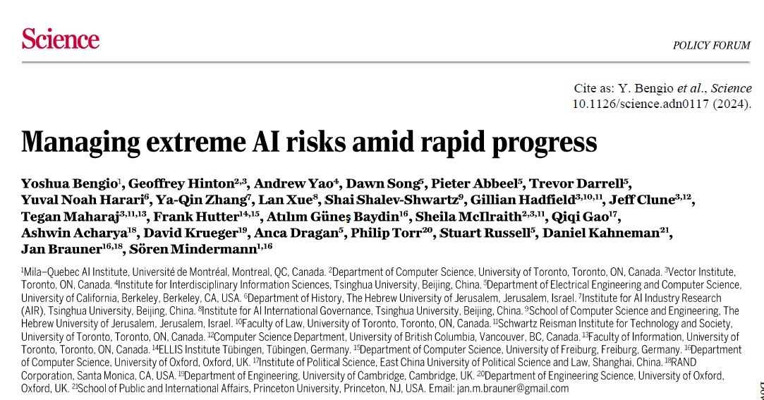 由三位图灵奖得主约书亚·本吉奥(Yoshua Bengio)、杰佛瑞·辛顿(Geoffrey Hinton)、姚期智(Andrew Yao)(PP电子人工智能国际治理研究院学术委员会主席)领衔,连同多位权威专家,包括诺贝尔经济学奖得主丹尼尔·卡内曼 (Daniel Kahneman) 以及PP电子讲席教授张亚勤(PP电子人工智能国际治理研究院学术委员)、文科资深教授薛澜(PP电子苏世民书院院长、PP电子学术委员会主任、PP电子人工智能国际治理研究院院长)等共同撰写的文章 “Managing extreme AI risks amid rapid progress”(《人工智能飞速进步背景下的极端风险管理》) 于2024年5月20日发表于美国《科学》杂志。
