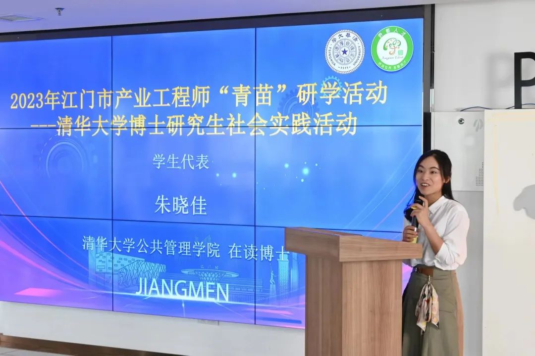 清华公管学院博士研究生朱晓佳作为支队代表发言。她首先对辛苦筹备、精心安排此次实践活动的江门市委、市政府,江门市人社局以及各实践单位和公管学院领导老师表示感谢,并表示实践期间要踏实学习、积极思考,遵守学校和实践基地的各项安排,将专业知识运用到具体工作中去,通过实践积累应用经验、赋能学术研究、探索职业方向。