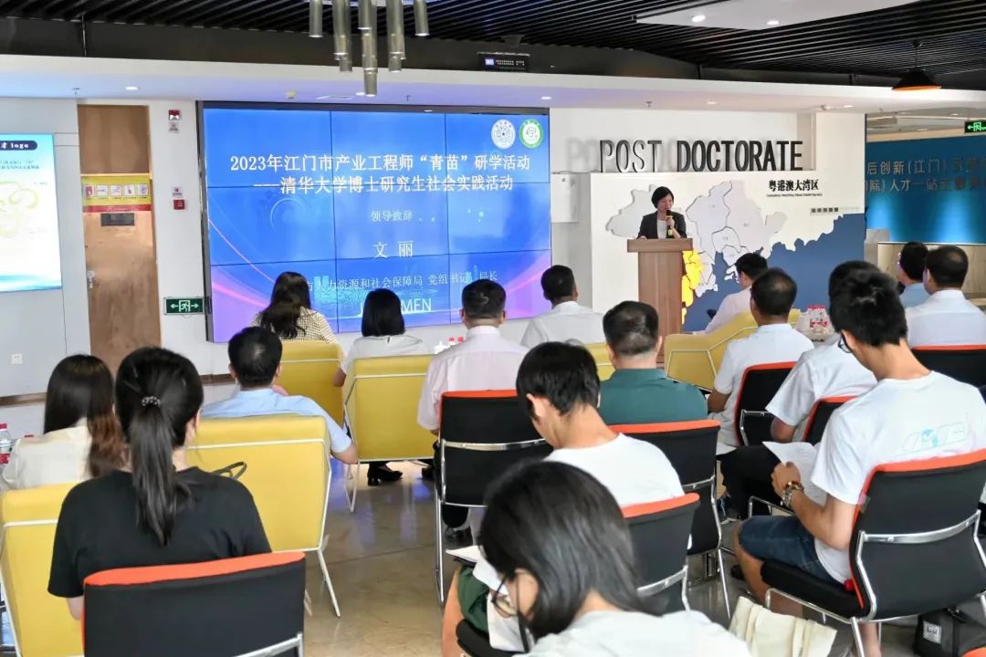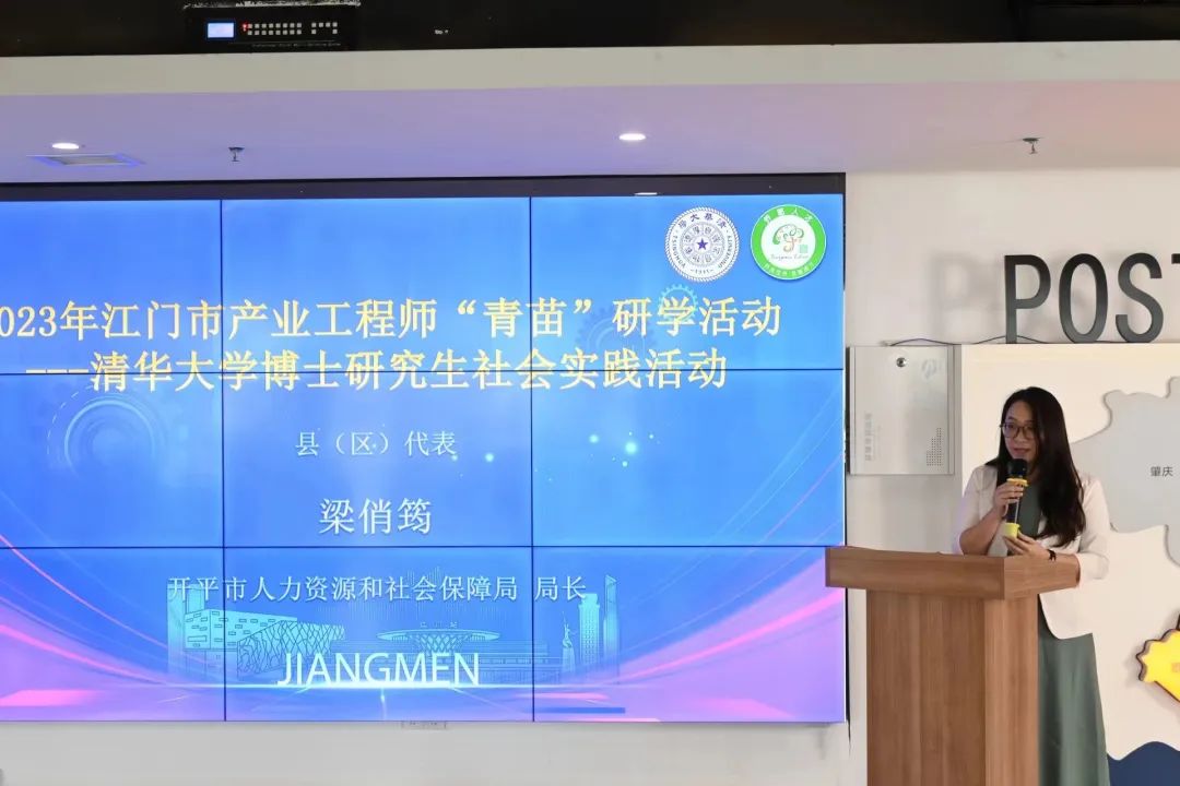 在观看江门市人才宣传短片《门迎天下》后,文丽进行致辞。她对公管学院师生的到来表示热烈欢迎,并介绍了江门市作为“第一侨乡”的特色。她表示,希望各位清华学子在接下来6周的实践中认识江门、感受江门的自然风景与人文风貌,结合江门市十五条产业链和八大战略性产业集群需求,积极发挥工作热情和学科专业优势,脚踏实地做好项目实践,为助力江门市经济社会高质量发展贡献智慧力量,期盼同学们在实践中发挥才干、作出贡献。