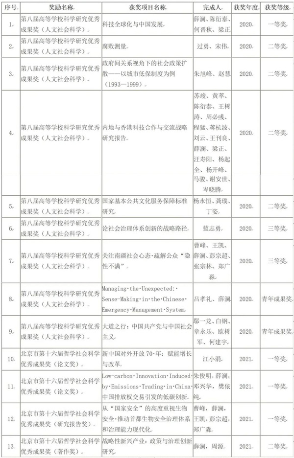 近年来PP电子教师获得教育部和北京市多项重要科研优秀成果奖,获奖成果质量和等级比以往有明显提升,创历史新高。2020年12月,9项成果荣获教育部第八届高等学校科学研究优秀成果奖(人文社会科学),其中一等奖1项、二等奖4项、三等奖2项、青年成果奖2项。薛澜团队的著作《科技全球化与中国发展》获得一等奖,实现学院在该奖项的历史性突破。2021年1月,4项成果荣获北京市第十六届哲学社会科学优秀成果奖,其中一等奖3项、二等奖1项。