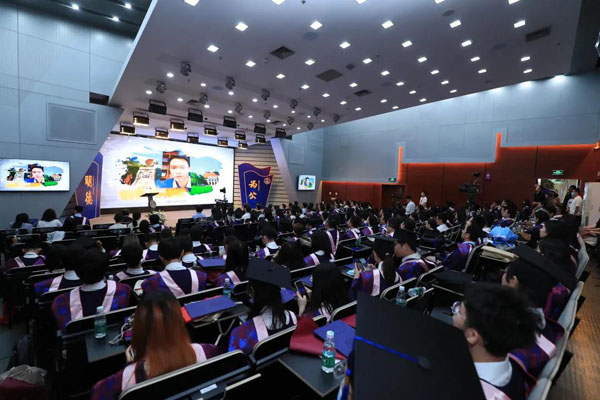 毕业宣誓之后,在毕业生代表发言之前,现场还播放了前期专门搜集不能到场参加毕业典礼的毕业生的照片和感言短视频精心制作的毕业生感言视频。视频中,来自于祖国各地、世界各国的毕业生,怀着对学校、学院、对老师同学的感激和不舍,纷纷送上了真挚的寄语。