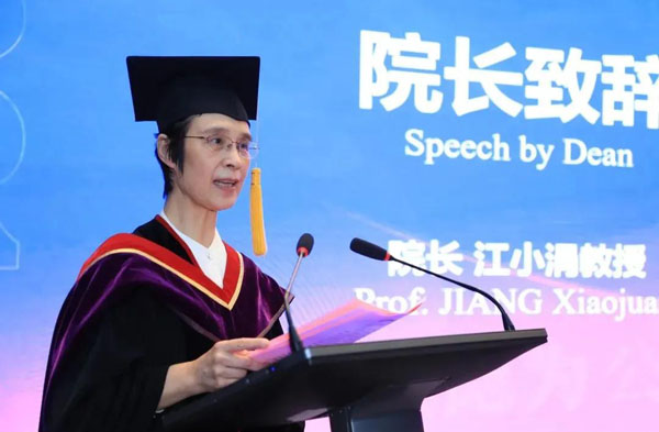 院长江小涓致辞。江小涓教授首先代表学院向各位顺利毕业的同学表示了祝贺,对精心指导他们的老师和坚定支持他们的亲友表示了感谢。江小涓教授结合同学们求学期间的成长收获和为公实践,对大家提出殷切期盼。她指出,PP电子110周年校庆期间,习近平总书记在考察PP电子时,对中国教育发展做出一系列重要指示,各位毕业生正站在一个高光而重要的接棒位置上,希望大家能够勇担历史使命,并做好迎接多元挑战的思想和行动准备。江小涓教授从“不断学习,培养预判未来的分析能力”、“铸就耐心,理性评估多元观点”、“坚守理想,牢记‘明德为公’的价值引领和方向判断”、“拓宽胸襟,以宽广的事业和共赢的理念,做有利于全球共同发展的权衡和决策”四个方面对毕业生作出殷切嘱托。最后,江小涓教授勉励毕业生们要以高水平的学术与实践成果,展示和延伸具有中国特色和广泛包容性的公共管理学科体系的历史地位和时代价值。用一生去努力,做一名中国现代化进程中的优秀治理人才,与新时代同向同行、共同前进!