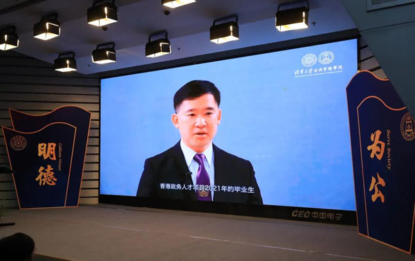 随后,现场播放了2018级EMPA毕业生代表胡健民的发言视频。来自香港的他首先表达了对师生同学的思念和学院悉心培养的感谢,随后与大家回忆了两年半的学习点滴和实践经历,并表示毕业不是一个完结,而是一个开始。“我们会用我们学会的,在未来香港的发展当中,在香港的公共管理,贡献我们的力量,为香港特别行政区一国两制的行稳致远,为中华民族的伟大复兴,贡献我们这一代清华人应有的担当!