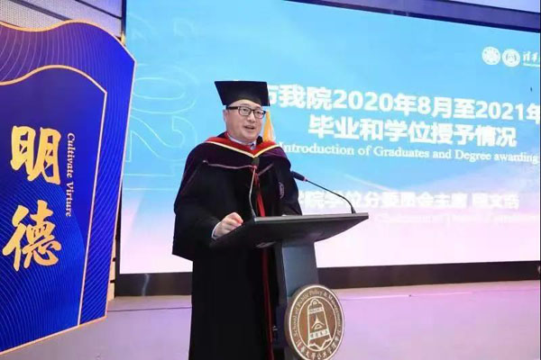 首先,程文浩宣布了公管学院2020年8月至2021年6月毕业和学位授予情况:从去年8月到今年6月,共有403位同学顺利完成学业、获得学位。其中,管理学博士学位31人,管理学硕士学位28人,直博兼修硕士1人,公共管理硕士学位313人(含EMPA 24人,国际项目留学生54人),此外,还有30名清华其他专业的本科生获得行政管理第二学士学位。