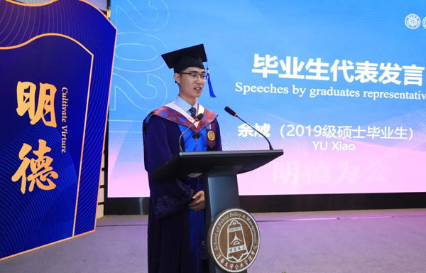 2019级学术硕士毕业生代表余虓在毕业典礼现场发言。回首两年学业、社工、校友交流的经历,余虓觉得一切都是最美好的安排。“自强不息,厚德载物”,感谢清华教会了自己君子之道的品格与意涵;“明德修远,为公致新”,感谢学院培养了自己以国家发展、人类进步为使命的公共精神。未来,他选择在毕业后成为一名地方选调生,希望在为人民服务的实践中践行和坚守清华公管人的使命。他衷心祝愿各位同学历尽千帆,归来仍少年!祝愿各位师长、亲友身体健康、工作顺利!祝愿公管学院不断发展,越来越好!祝福我们的国家繁荣昌盛!