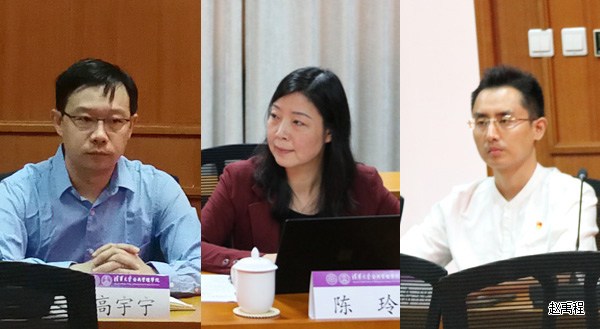 教师代表高宇宁(左一)、陈玲(左二)、赵禹程(右一)做交流发言