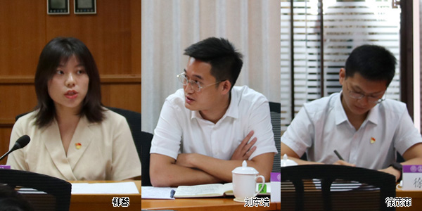 博士生代表柳馨(左一)、刘东浩(左二)、徐茂森(右一)做交流发言