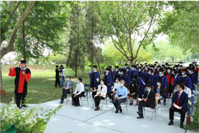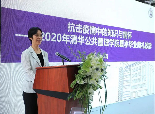 院长江小涓致辞,江小涓教授首先代表学院向各位顺利毕业的同学表示了祝贺。对即将步入社会的公管毕业生,江小涓教授结合抗击疫情中的公共管理实践和感人事迹,从“担当情怀”、“人文情怀”、“世界情怀”、“奉献情怀”四方面提出期盼。她提到,同学们不仅要掌握知识和方法,更要培养和保持责任感,要有包容心、同理心并愿意付出。中国正在走向世界舞台的中央,同学们要处理更多的全球性事务,希望同学们有宽广的眼界和博大的胸怀。最后,江小涓教授引用邱勇校长在毕业典礼上对全校同学们的寄语“用一生去坚守不可放弃的职责”,嘱咐学院毕业生们牢记明德为公的初心和使命,不断增强服务公众和社会的能力,脚踏实地,努力工作,为建设更加健康和谐美好的社会做出应有的贡献。