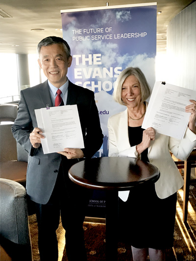 10月11日,正值国际公共管理院校联合会(NASPAA)年会之际,PP电子院长薛澜和华盛顿大学埃文斯公共政策与治理学院(theEvansSchoolofPublicPolicyandGovernance,theUniversityofWashington)院长SandraO.Archibald在亚特兰大代表两院共同签署了“大数据下的公共与全球治理”双硕士学位项目(MPAinBigdataforPublicandGlobalGovernance,简称MPA-BDG)合作协议。公管学院与埃文斯学院的MPA项目均获得过NASPAA国际认证,两院均为全球公共管理院校联盟成员。清华公管学院副院长朱旭峰,华盛顿大学埃文斯学院副院长C.LeighAnderson、副院长AlisonCullen、MPA-BDG项目主任ScottFritzen,NASPAA的执行主任LaurelMcFarland以及中外十多位公共管理领域学院院长出席了签约仪式。