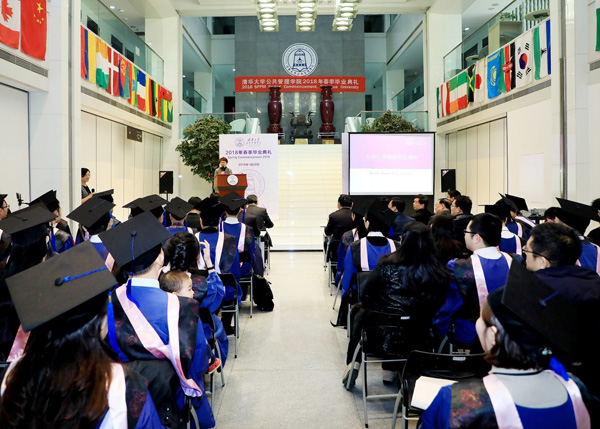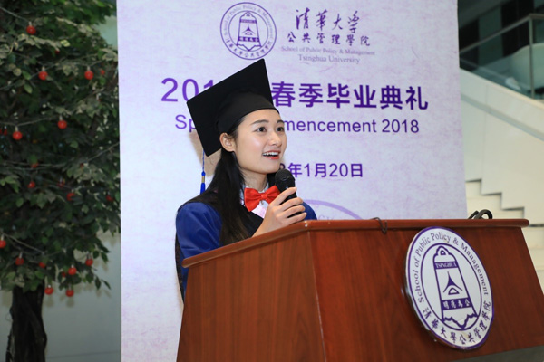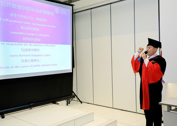 12级博士毕业生张潮带领全体毕业生宣誓:“铭记师长教诲,肩负时代使命,弘扬清华精神,成就民族伟业。明德为公,致知为民;精邃做事,正心为人;青衿矢志,求真笃行;言出身随,誓底功成。”张潮毕业后将赴苏州大学任教,并获聘副教授岗位。2018年他将带着公管精神继续前行,传递给更多关注公共管理的学子。