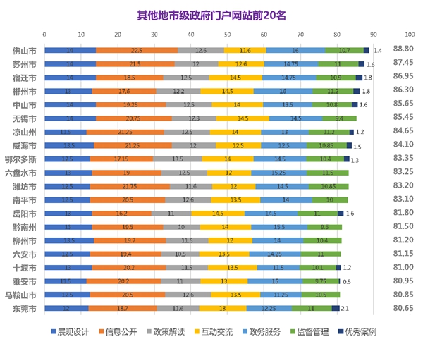 其他地市级政府门户网站前二十名:1.佛山市,2.苏州市,3.宿迁市,4.郴州市,5.中山市,6.无锡市,7.凉山州,8.威海市,9.鄂尔多斯市,10.六盘水市,11.潍坊市,12.南平市,13.岳阳市,14.黔南州,15.柳州市,16.六安市,17.十堰市,18.雅安市,19.马鞍山市,20.东莞市。