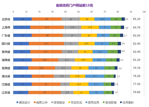 省级政府门户网站前十名:1.北京市,2.上海市,3.广东省, 4.四川省,4.(并列)贵州省,6.湖南省,7.海南省,8.湖北省,9.江西省,10.