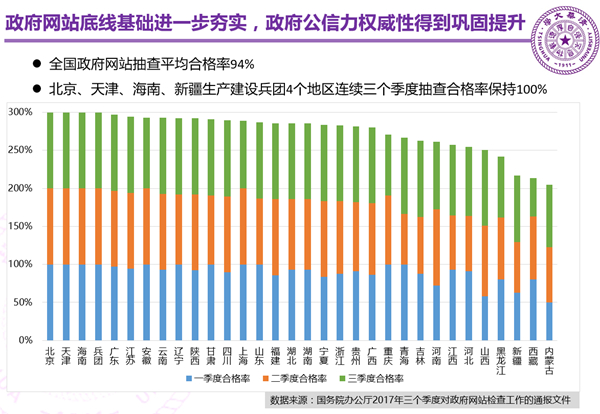(二)全国政府网站常态化监管机制持续巩固,2017年国务院办公厅组织的三个季度抽查合格率平均94%,北京、天津、海南、新疆生产建设兵团4个地区连续三个季度抽查合格率保持100%
