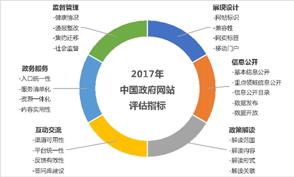报告从信息公开、政策解读、互动交流、政务服务、展现设计、监督管理6个指标维度对国家部委、省级、地市级政府门户网站的建设管理水平进行评估。