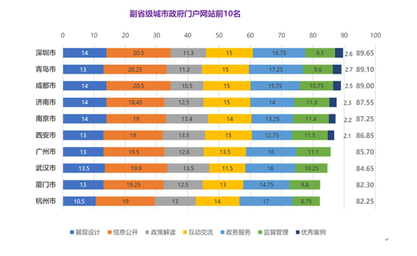 副省级城市政府门户网站前十名:1.深圳市,2.青岛市,3.成都市,4.济南市,5.南京市,6.西安市,7.广州市,8.武汉市,9.厦门市,10.杭州市。