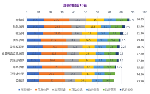 部委网站前十名:1.商务部,2.税务总局,3.林业局,4.质检总局,5.发展改革委, 6.交通运输部,6.(并列)食品药品监管总局、8.海关总署,9.卫生计生委,10.公安部。
