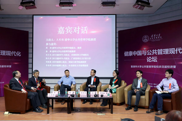 主题演讲环节之后,在清华公管学院教授王有强的主持下,论坛进入沙龙环节。清华公管学院薛澜教授、俞樵教授,2012级MPA-E校友、首都医科大学副校长孙力光,2012级MPA-E校友、广西贺州市卫计委主任陈文珍,2005级博士校友、国家行政学院副教授胡颖廉,2008级博士校友、中央财经大学助理教授李海明共同就“健康中国”和公共管理现代化建设开展了深入的探讨。各位专家从医疗健康新技术、健康数据整合、健康资源体系建设、养生健康产业发展、药品产业政策改革、医患关系等方面阐释了对“健康中国”战略的认识。与会专家们一致认为,“健康中国”建设需要新的发展模式,运用公共管理手段对各方面资源进行体系化的梳理和整合是建设“健康中国”的必由之路。