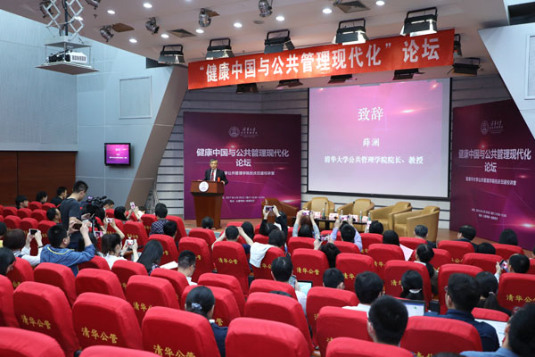图为清华公管学院院长薛澜发表致辞。