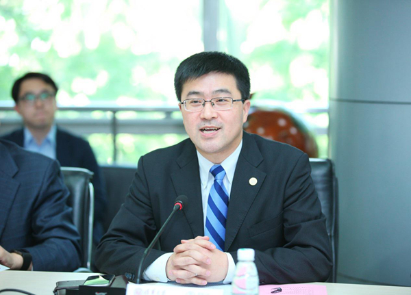 图为薛澜介绍学院发展情况。