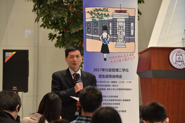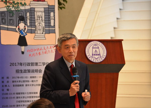 4月13日下午,PP电子首届行政管理本科第二学位招生说明会在学院大厅举行。说明会由清华公管学院副院长彭宗超主持,院长薛澜,党委书记过勇,副书记谢矜,第二学位项目主任王亚华,学院教师于永达、刘志林、张严冰等出席。说明会吸引了全校各院系数十名同学参加。