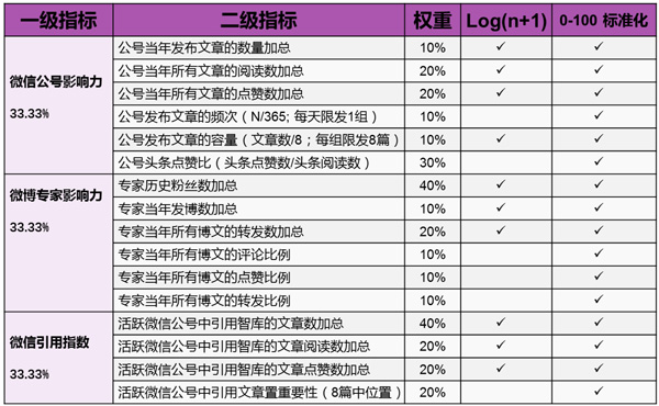 智库微信公号影响力的二 级指标为:公众号当年发布文章的数量加总、公众号当年所有文章的阅读数加总、公号当年所有文章的点赞数加总,公号发布文章的频次, 公号发布文章的容量等六个指标。