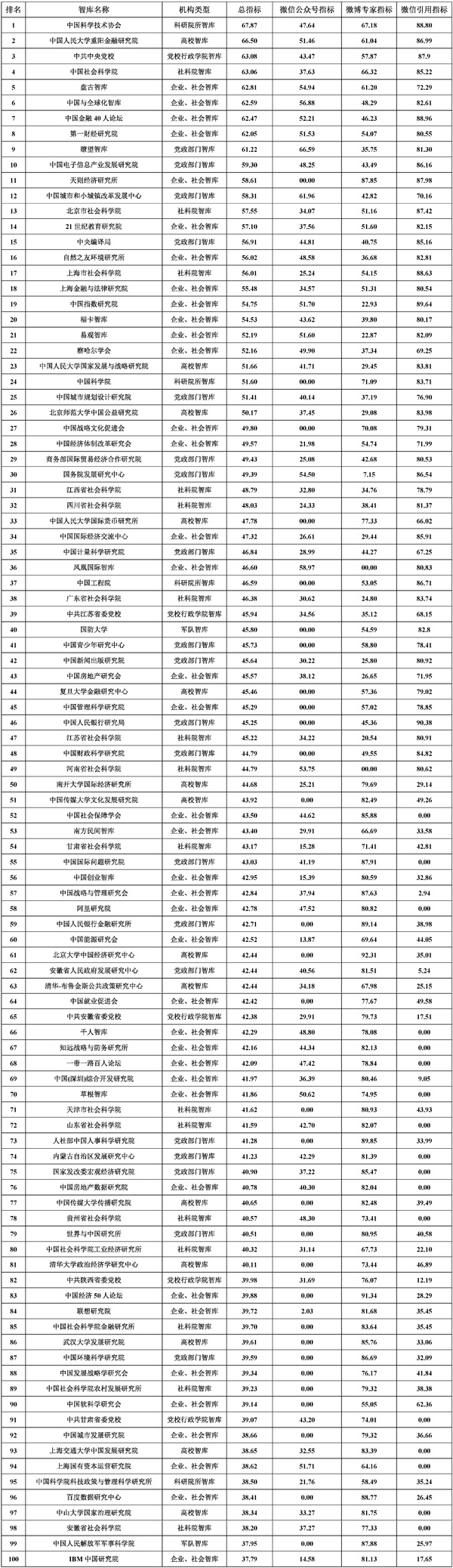 微信引用影响力(所有微 信公号推送文章中提到了某家智库情况以及这些文章的影响力)的二级指标为:活跃微信公众号中引用智库的文章数加总、活跃微信公号中 引用智库的文章阅读数加总、活跃微信公号中引用智库的文章点赞数加总、活跃微信公号中引用文章位置重要性等四个指标。