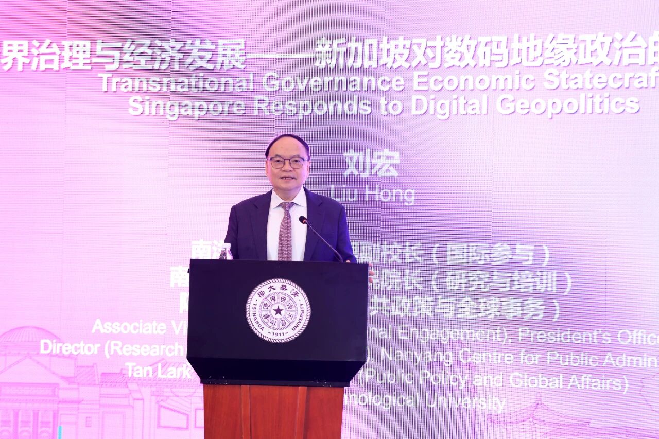 新加坡南洋理工大学协理副校长(国际参与)、南洋公共管理研究生院院长(研究与培训)、陈六使讲席教授(公共政策与全球事务)刘宏以“跨界治理与经济发展——新加坡对数码地缘政治的回应模式”为题发言。他指出,在数码地缘政治时代,科技二元化与标准之争已超越领土边界。新加坡以贡献约20%政府预算、投资活跃度位居全球前列的淡马锡与GIC两大主权基金为双引擎,凭借全球网络布局、动态治理和跨界合作,积极主动参与新地缘政治,将国家资本转化为对外政策与软实力工具,为中小国在碎片化世界中实现韧性增长提供示范。