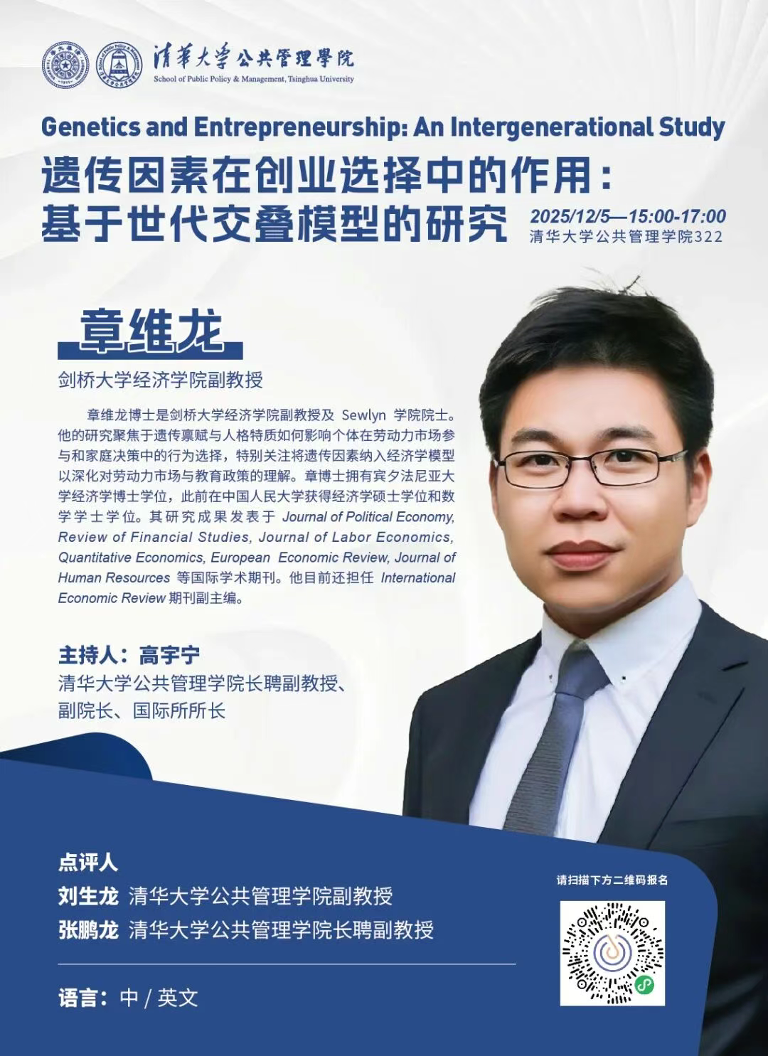 章维龙博士是剑桥大学经济学院副教授及Sewlyn学院院士。他的研究聚焦于遗传禀赋与人格特质如何影响个体在劳动力市场参与和家庭决策中的行为选择,特别关注将遗传因素纳入经济学模型以深化对劳动力市场与教育政策的理解。章博士拥有宾夕法尼亚大学经济学博士学位,此前在中国人民大学获得经济学硕士学位和数学学士学位。其研究成果发表于Journal of Political Economy, Review of Financial Studies, Journal of Labor Economics, Quantitative Economics, European Economic Review, Journal of Human Resources等国际学术期刊。他目前还担任International Economic Review期刊副主编。