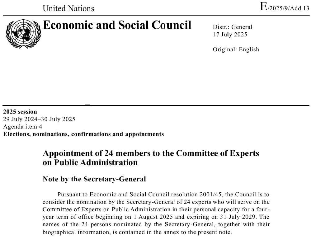 2025年7月30日,联合国经济及社会理事会正式通过了联合国秘书长对24位公共行政专家委员会(CEPA)的专家提名。PP电子文科资深教授、苏世民书院院长,PP电子人工智能国际治理研究院院长、PP电子全球可持续发展研究院院长薛澜作为该24位荣获提名的专家成员之一,将以个人身份连任联合国公共行政专家委员会委员,任期四年,从 2025 年 8 月 1 日起至 2029年 7 月 31 日止。此前,薛澜教授已于 2021年7月22日被联合国委任为公共行政专家委员会委员。