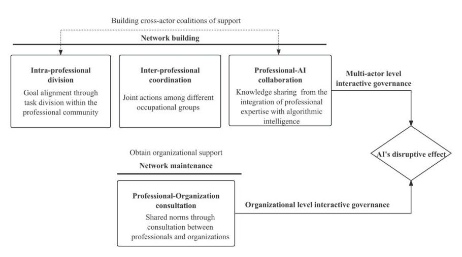 本研究基于“人—机—社会”交互框架,揭示医务人员在与AI互动中的普遍性应对模式。面对AI破坏性影响,他们并非被动适应,而是通过构建协作网络、强化专业关系、嵌入组织结构与持续协商,主动应对管辖权重构。在与同行、技术、管理者及制度的互动中,医务人员不断协商AI的功能定位、使用边界与责任归属,实质性参与技术在临床场景中的再塑造。