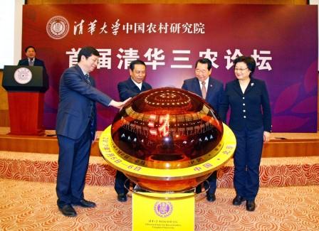 图为邱勇(左一)、陈锡文(左二)、谢国民(右二)、李海峰(右一)启动“清华三农论坛”。 (石加东 摄)