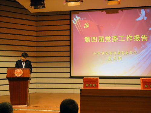 大会由学院第四届党委副书记谢矜主持,第四届党委书记孟庆国代表第四届党委作工作报告,从党员发展、组织建设、思想宣传、学生工作、配合行政、构建和谐家园等方面向全体党员汇报了工作成绩和不足,号召大家要进一步学习贯彻党中央的路线方针政策,发挥学科优势建言献策;党委要发挥思想引领作用,紧密围绕学校中心工作,以人事制度改革为契机,积极配合行政创建一流学科,为实现中华民族伟大复兴的中国梦、为中国特色社会主义事业的成功而努力奋斗。