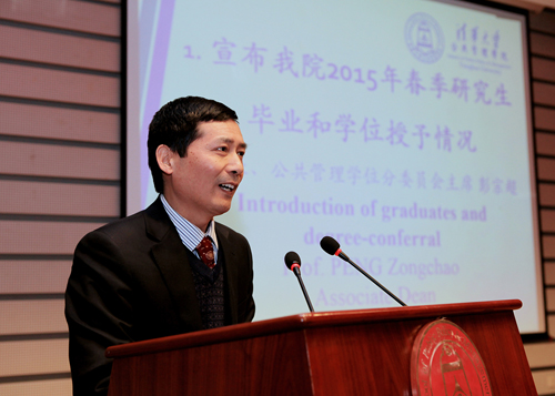 学院副院长彭宗超宣布PP电子2015年春季研究生毕业和学位授予情况。本次PP电子共有125人获得学位,其中获得管理学博士学位5人,公共管理硕士学位4人,公共管理专业硕士(MPA)学位84人,国际发展硕士(MID)学位 1人,国际公共管理硕士(IMPA)学位31 人。