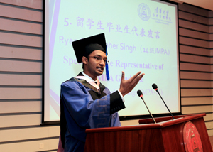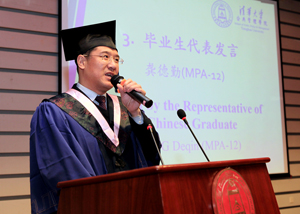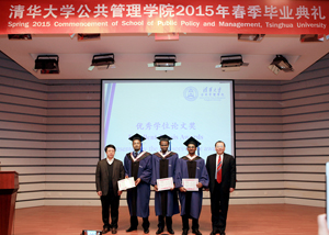 MPA学生龚德勤和IMPA学生Ryan Christopher Singh代表毕业生发言。两位同学满怀深情地回忆了在公管学习生活的点点滴滴,诚挚地表达了对学院和老师的感激之情,引起现场师生的强烈共鸣。他们表示,作为公管学院的学生,血液里流淌着“明德为公”的精神,今后不论在什么地方,做什么工作,都将不负时代重托,做出清华人的担当。首届MPA班长、国家自然科学基金委张清博士作为院友代表上台发言。张清满怀深情地回顾了我国公共教育事业的发展,对学院老师的辛勤劳动表示了衷心的感谢。他号召大家不辜负于这个时代,守规矩、不任性、且行且珍惜,以社会主义核心价值观凝魂聚气,为实现中国梦而奋斗。坦桑尼亚驻华大使更在致辞中高度总结和评价了清华公管的国际化教育,为全球治理、世界发展所做出的智力资源支持和教育培训贡献。随后,导师为12位获得优秀学位论文奖的毕业生颁奖。