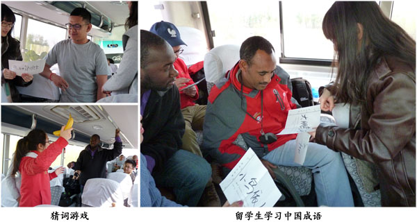 回程途中,大家首先进行了自我介绍。在随后的猜词游戏中,中外学生两两为一组,用肢体语言让对方猜测指定的中国成语或英文俗语,并互相教授词语的含义和发音,帮助外国学生提高汉语水平,也有助于中国学生练习英文。游戏环节将活动推向了高潮,一时间,欢声笑语,其乐融融。在短暂的半天里,大家度过了愉快的时光。