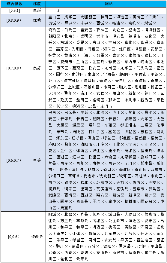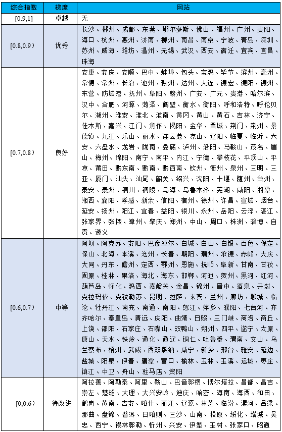其中,综合指数在0.9(含)以上的为“卓越”,指数在0.8(含)至0.9之间的为“优秀”,指数在0.7(含)至0.8之间的为“良好”,指数在0.6(含)至0.7之间的为“中等”,指数在0.6以下的为“待改进”。
