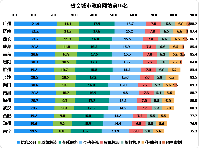 省会城市政府网站中,广州、济南和西安位列前三名,成都和南京并列第四名,贵阳、杭州、长沙、海口、南昌分列六至十名,福州/武汉、合肥、郑州和南宁分列十一至十五名。得分如下: