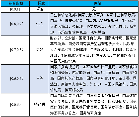 国务院部门网站梯度分布结果如下(注:各梯度内网站按首字汉语拼音升序排序):